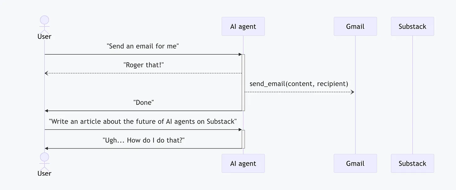 How about integrating all platforms first then? Would you want to write on Substack forever? There will always be alternatives for everything, so this is not an option. Therefore, the AI agent of today can only work with a specific set of “tools” that it knows “how to use” them.