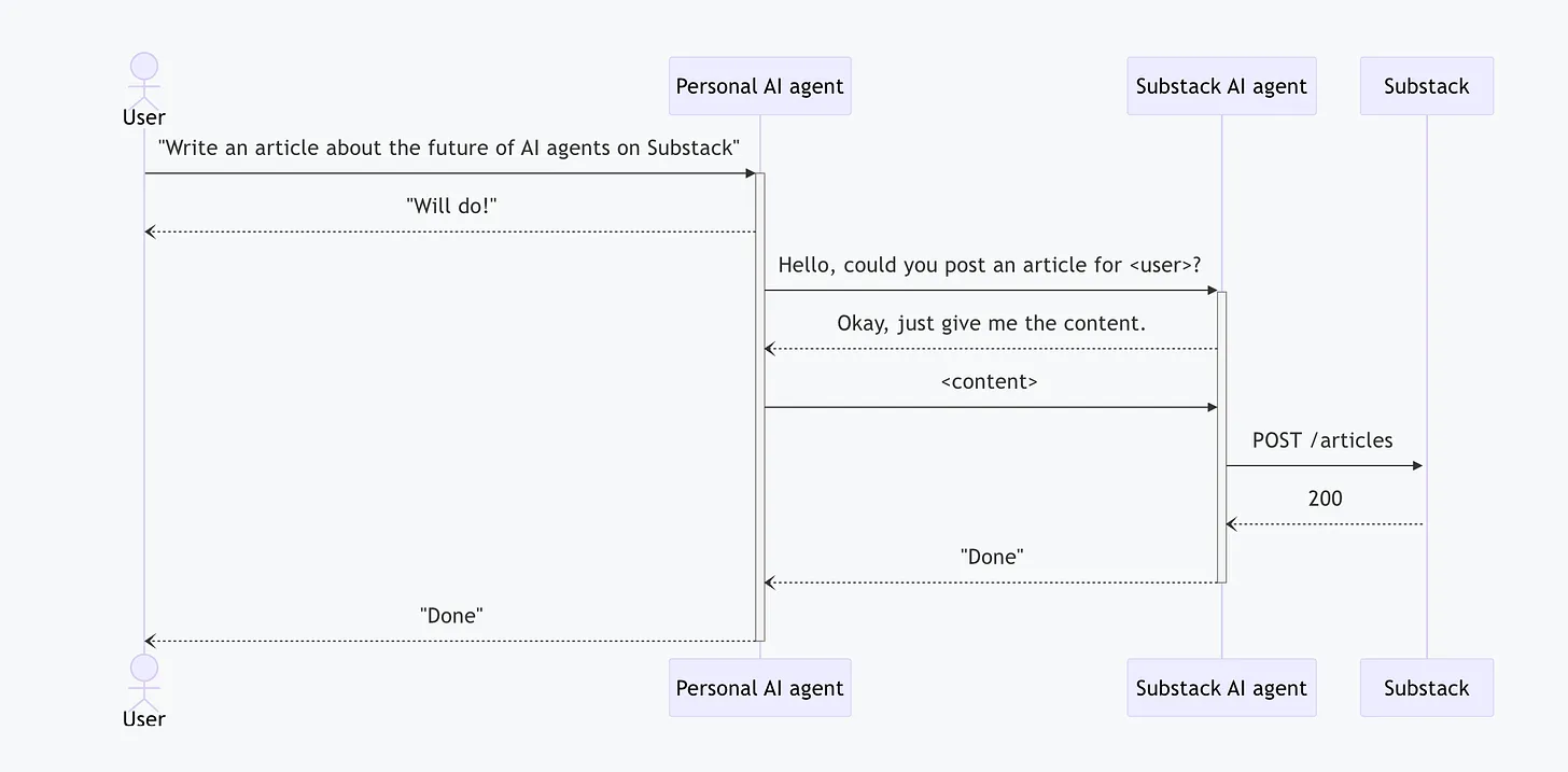 Mapping to our scenario, instead of letting your AI agent learn how to use the APIs before interacting with Substack, it only has to interact with another AI agent trained specifically for working with Substack’s APIs. Your AI agent will provide your identity and the content of the article and the Substack AI agent will do the rest.