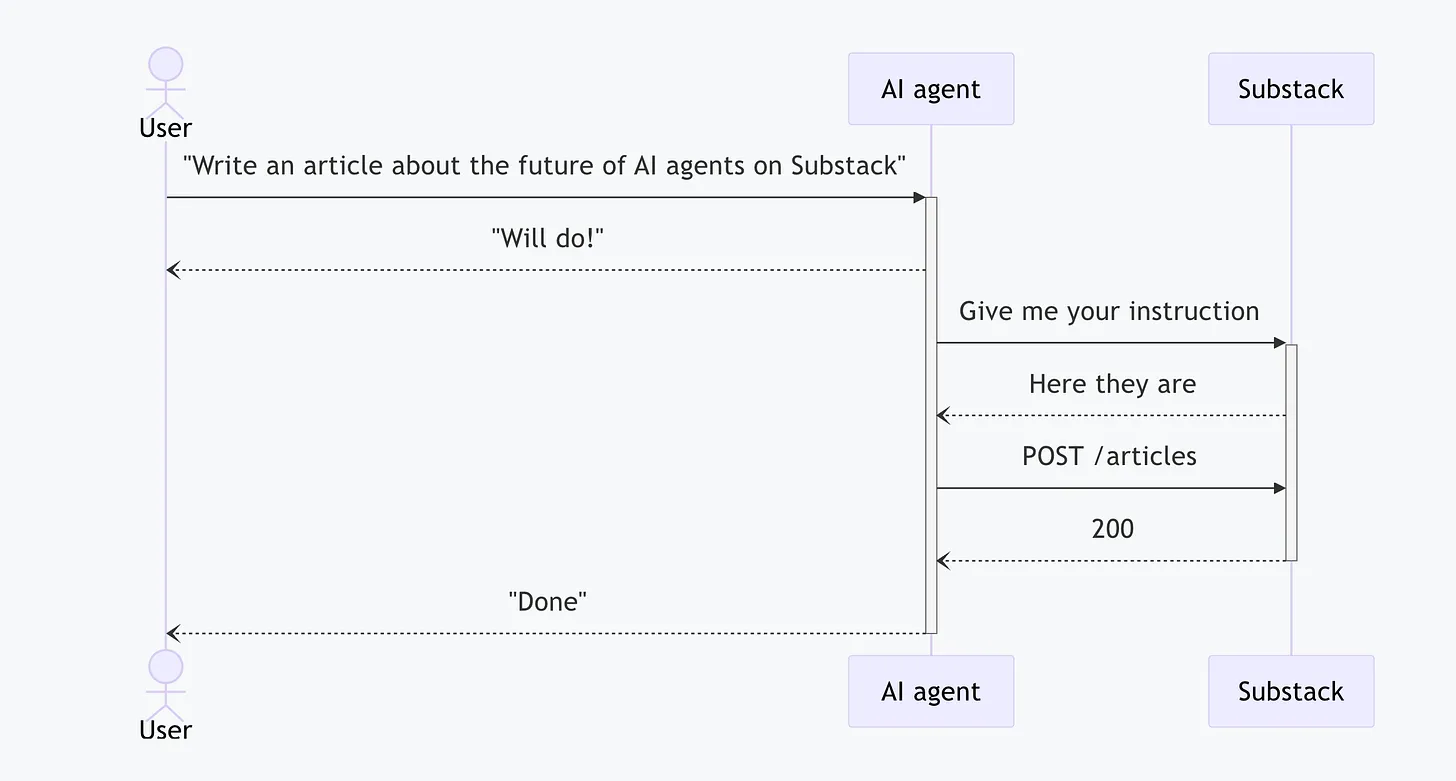 Mapping to our scenario, in the previous example where the AI agent can’t understand the request “Write an article about the future of AI agents on Substack”, it can now learn how to use the APIs with the instructions provided by Substack. It reads the instructions, selects the appropriate endpoint, and sends the request.